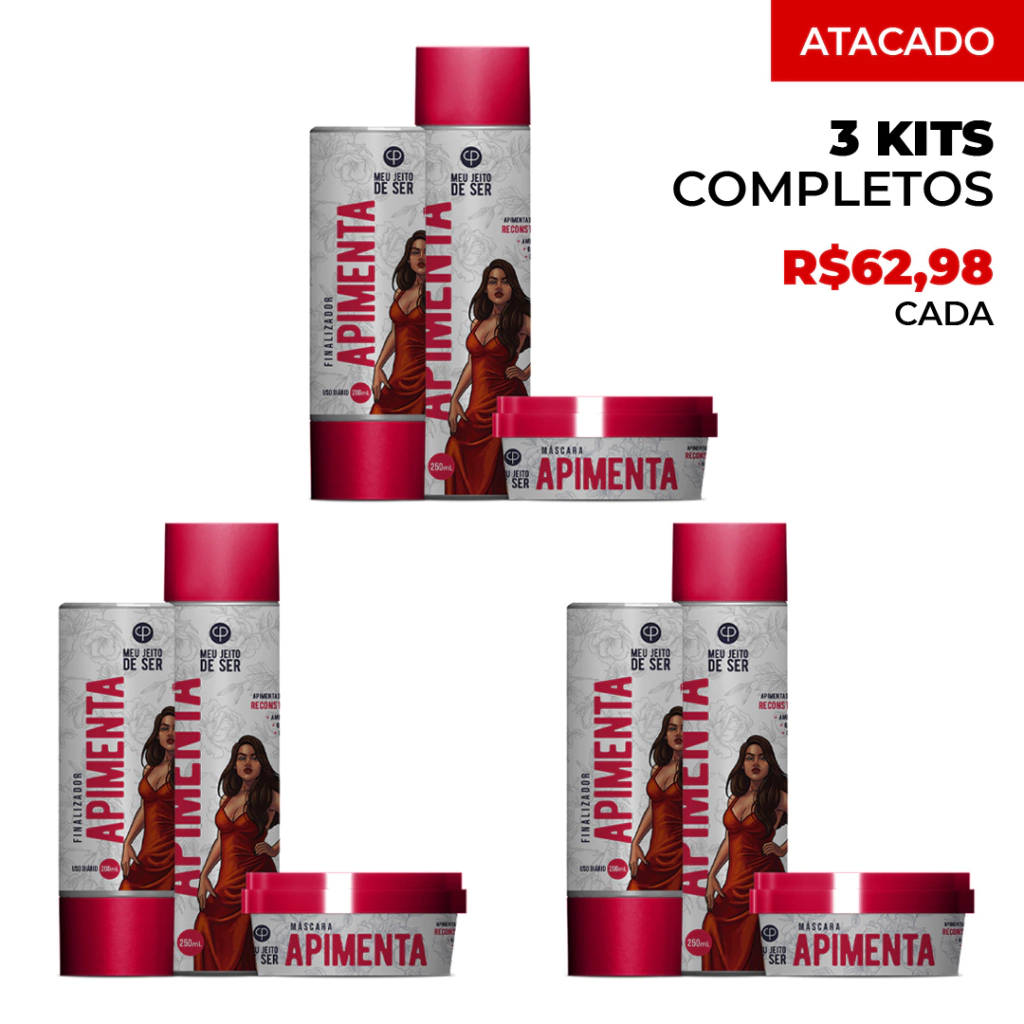 Kit de Reconstrução Capilar Apimenta com Colageno e Queratina, tratamento completo para atender às necessidades de fios danificados e quebradiços. Diretamente da fábrica vendido pela Oficina dos Cosméticos. Com 28 anos de experiência, nossos produtos profissionais estão em mais de 60 mil salões pelo Brasil.